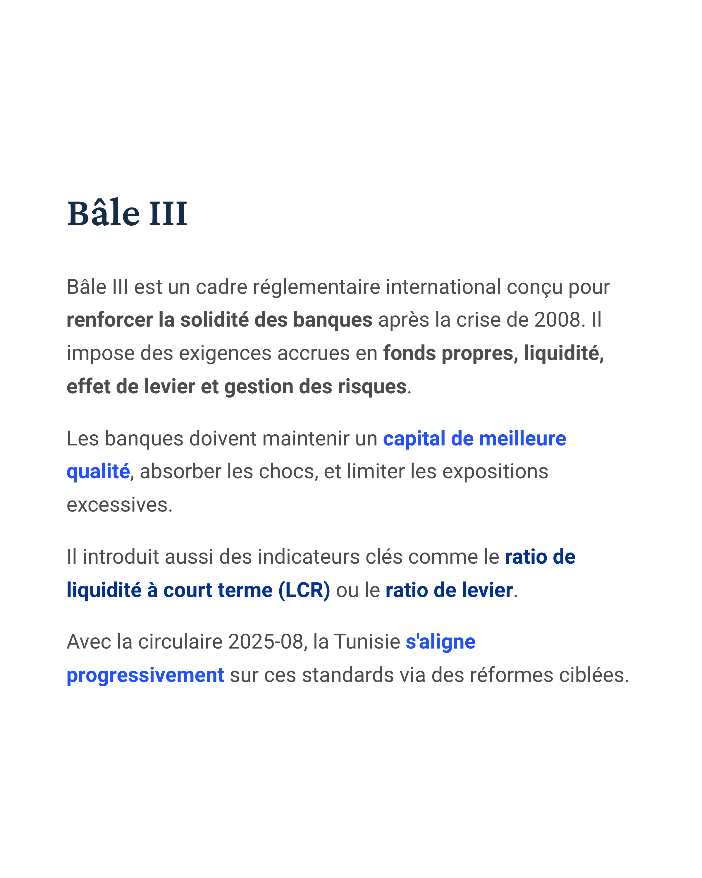 - Bâle III, ensemble de recommandations prudentielles, fixe des exigences renforcées en fonds propres, en ratios de liquidité, et en répartition des risques. Il impose à chaque banque de mieux calibrer ses réserves face à ses activités.