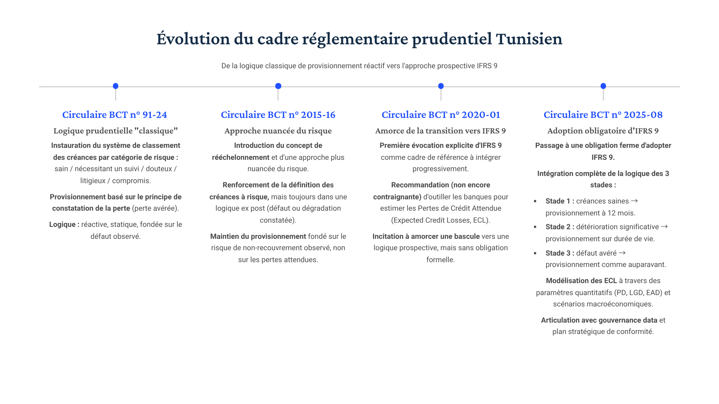 En Tunisie, plusieurs circulaires antérieures (2020-01, 2015-16...) ont amorcé une convergence vers ces standards. Mais les retours de terrain sont clairs : les dispositifs restent partiels, la mise en œuvre hétérogène, et la gouvernance de la donnée encore trop embryonnaire.