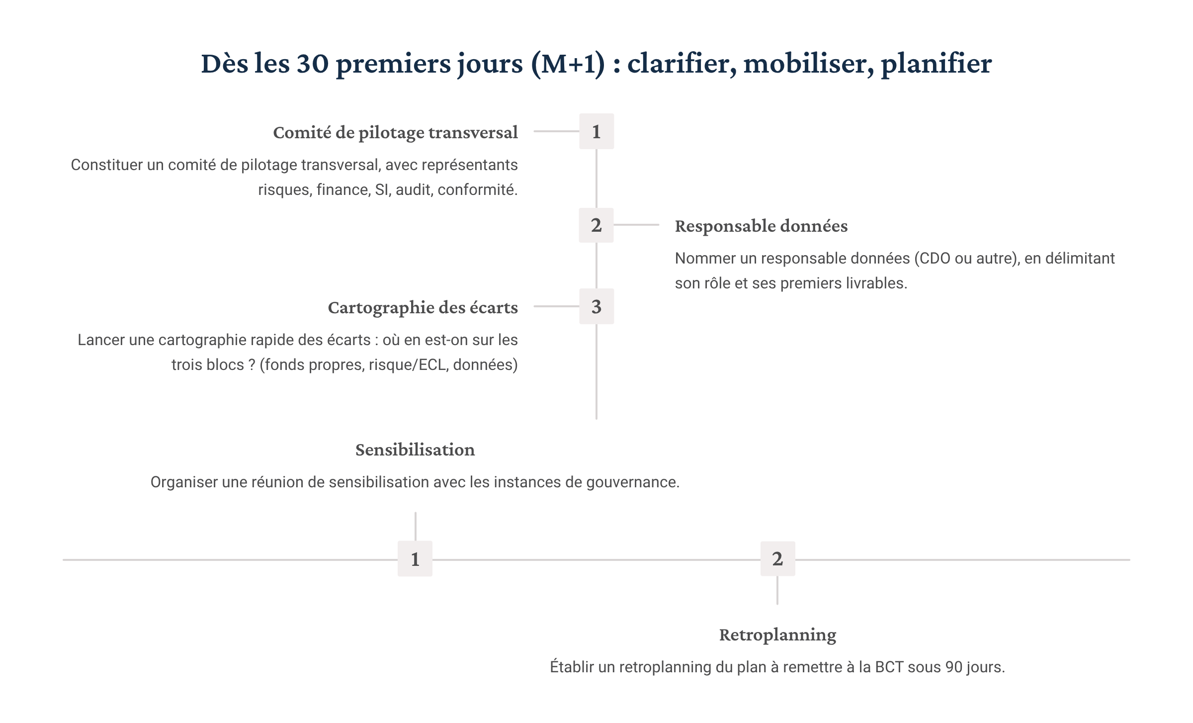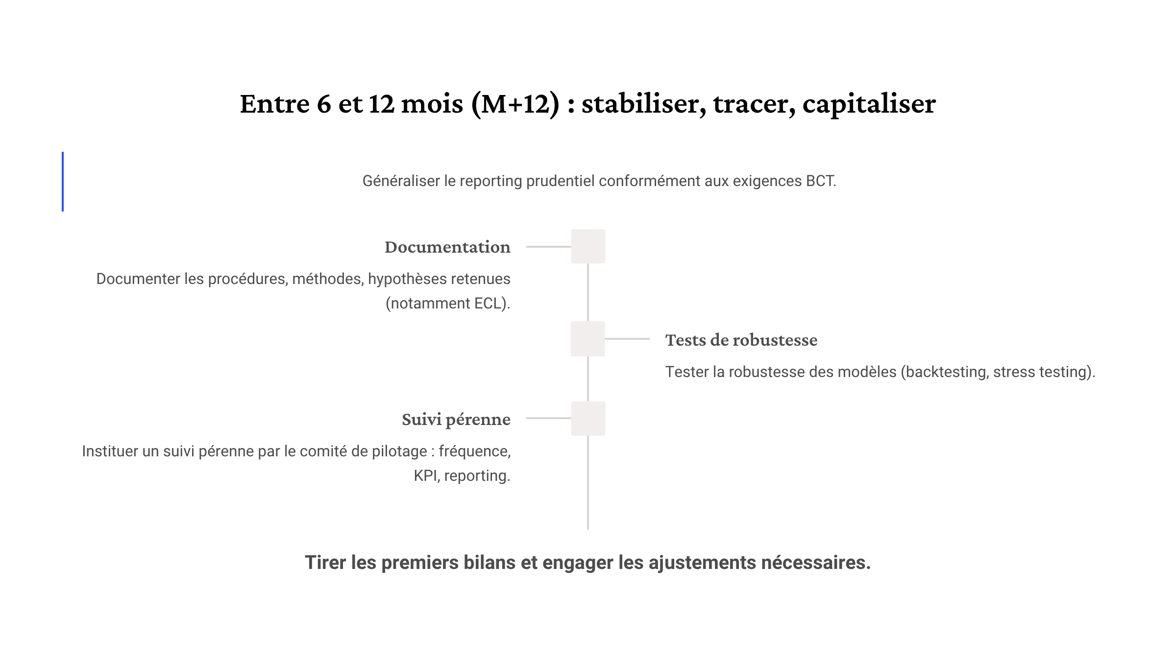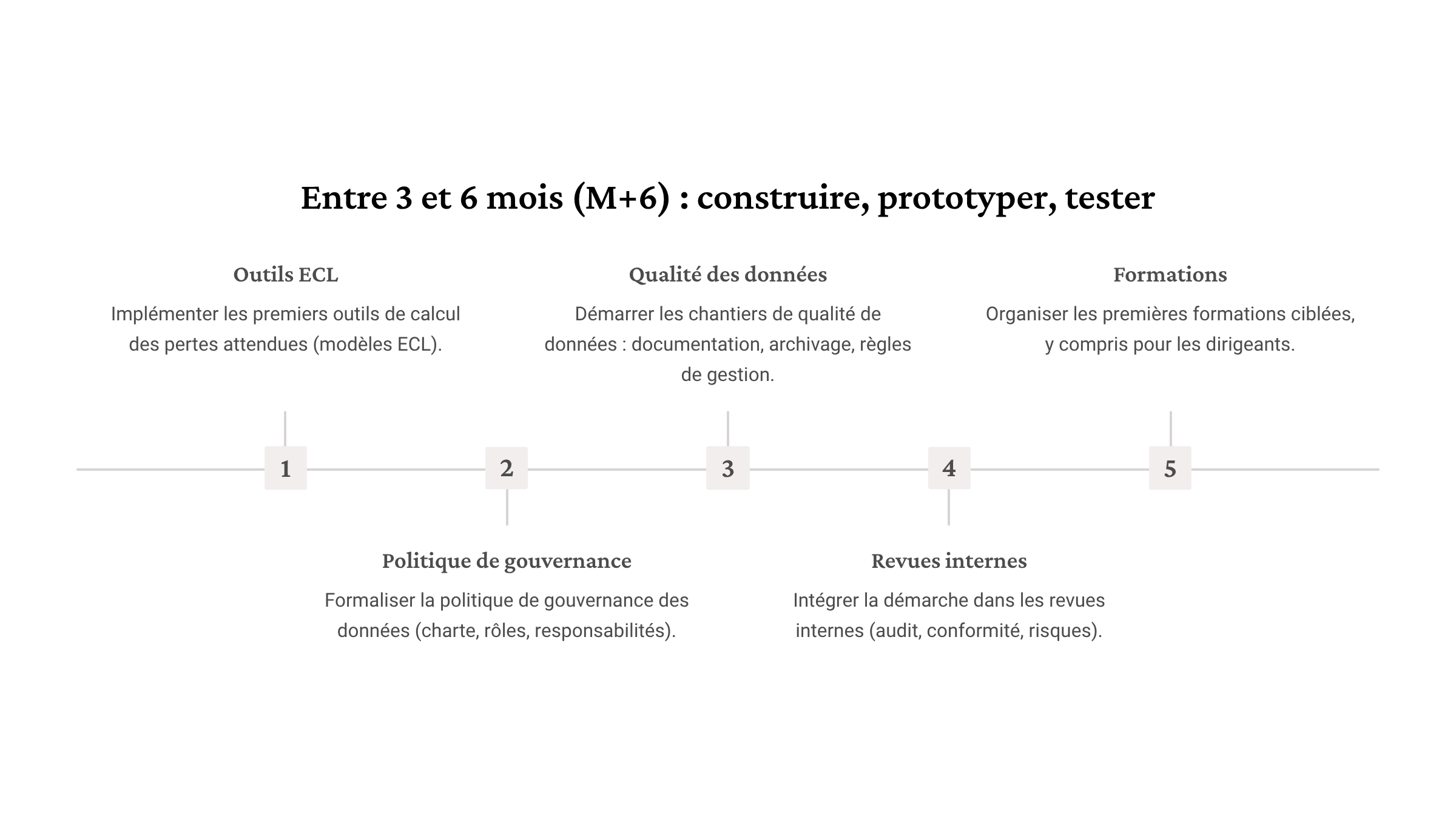 - Engager réellement les chantiers validés : modélisation ECL, formalisation de la politique de gouvernance des données, cadrage des maquettes de reporting.