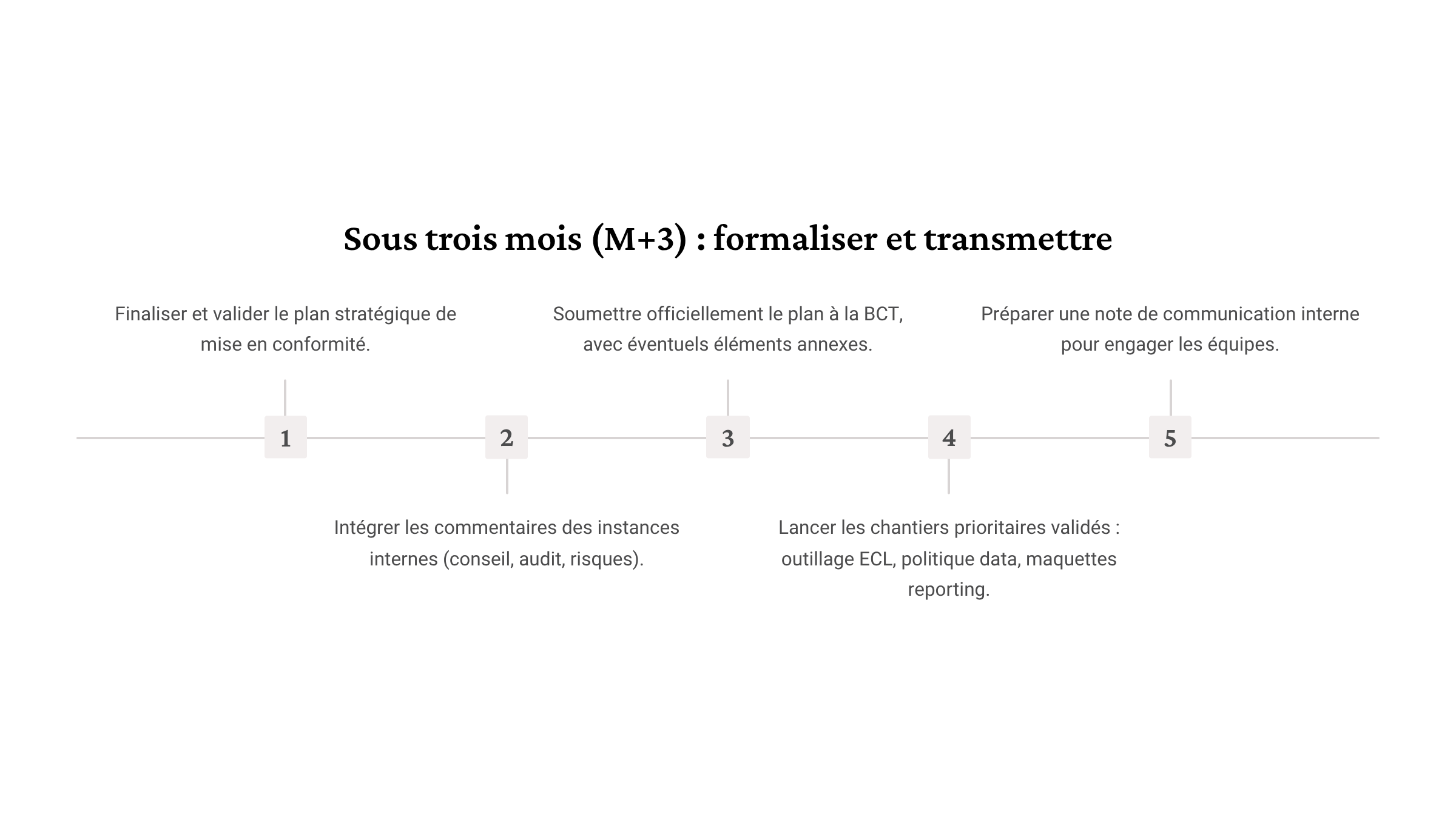 - Et bien sûr, établir un calendrier réaliste, avec un plan d’action à remettre à la BCT dans un délai de 90 jours.